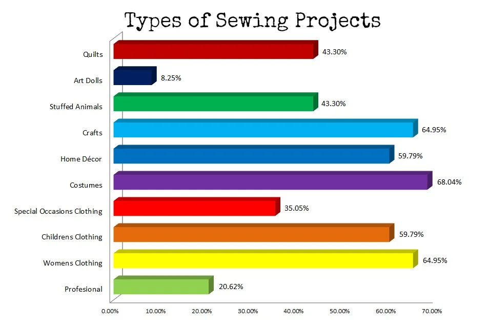 She received about 100 replies and from those replies, she saw some patterns. Some things despite the internet have not changed. The large majority of those who responded were women, most were between the ages of 25-44 and most had starting sewing before the age of twenty.